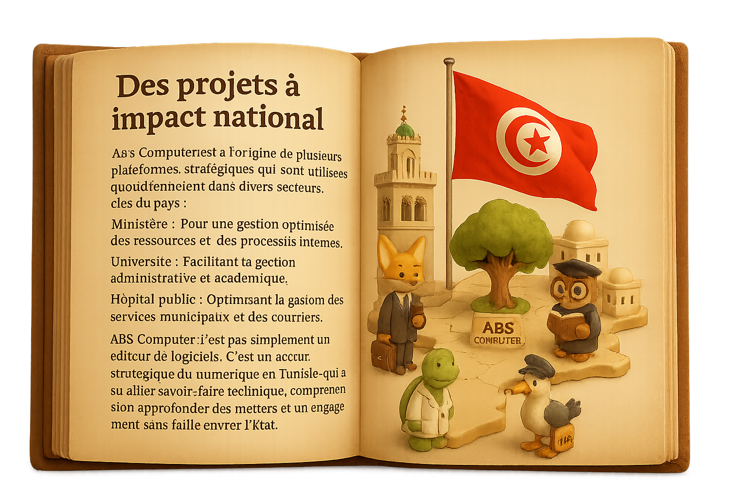 ABS Computer est à l'origine de plusieurs plateformes stratégiques qui sont utilisées quotidiennement dans divers secteurs clés du pays : Ministère : Pour une gestion optimisée des ressources et des processus internes. Université : Facilitant la gestion administrative et académique. Hôpital public : Améliorant la gestion des personnels et des équipements médicaux. Collectivité locale : Optimisant la gestion des services municipaux et des courriers. ABS Computer n’est pas simplement un éditeur de logiciels. C’est un acteur stratégique du numérique en Tunisie, qui a su allier savoir-faire technique, compréhension approfondie des métiers et un engagement sans faille envers l’État. Aujourd’hui encore, ABS demeure une référence incontournable, aussi bien dans le secteur public que privé, contribuant activement à la modernisation et à l'efficacité des institutions tunisiennes.