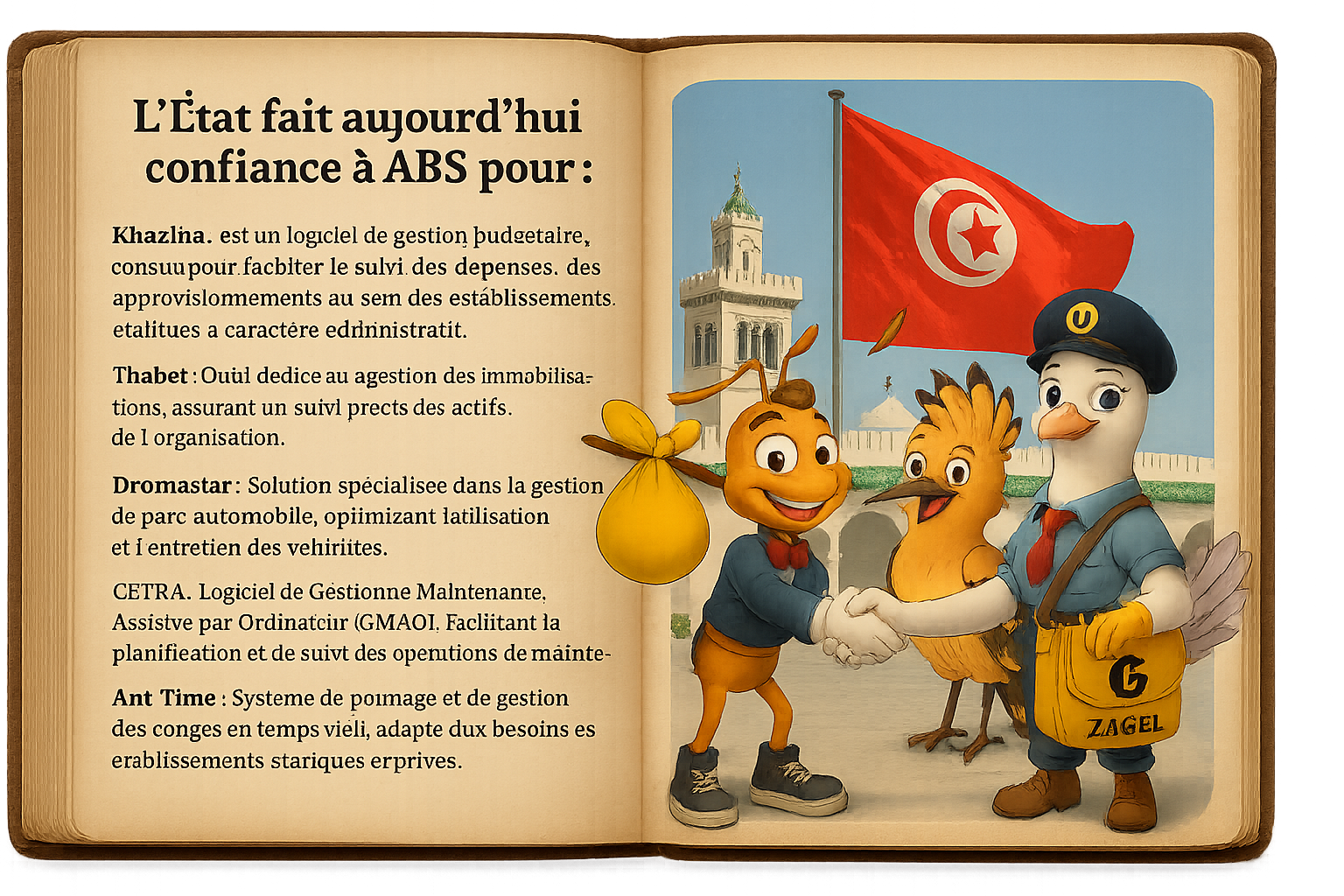 Khazina : est un logiciel de gestion budgétaire, conçu pour faciliter le suivi des dépenses et des approvisionnements au sein des établissements étatiques à caractère administratif. Il offre un accès en temps réel à toutes les pièces budgétaires, propose des tableaux de bord détaillés avec statistiques et représentations graphiques, et améliore la qualité du service en optimisant la gestion financière. Wadhifa : Solution complète de gestion des ressources humaines, permettant une gestion efficace du personnel, des carrières et des formations. Thabet : Outil dédié à la gestion des immobilisations, assurant un suivi précis des actifs de l'organisation. Dromastar : Solution spécialisée dans la gestion de parc automobile, optimisant l'utilisation et l'entretien des véhicules. CETKA : Logiciel de Gestion de Maintenance Assistée par Ordinateur (GMAO), facilitant la planification et le suivi des opérations de maintenance. Ant-Time : Système de pointage et de gestion des congés en temps réel, adapté aux besoins des établissements étatiques et privés. ZAGEL : une solution intelligente de gestion du courrier, qui centralise les entrées et sorties tout en assurant un suivi fluide et sécurisé, il facilite le dispatching entre les services, garantissant une circulation efficace des documents et une traçabilité optimale au sein de l’établissement.